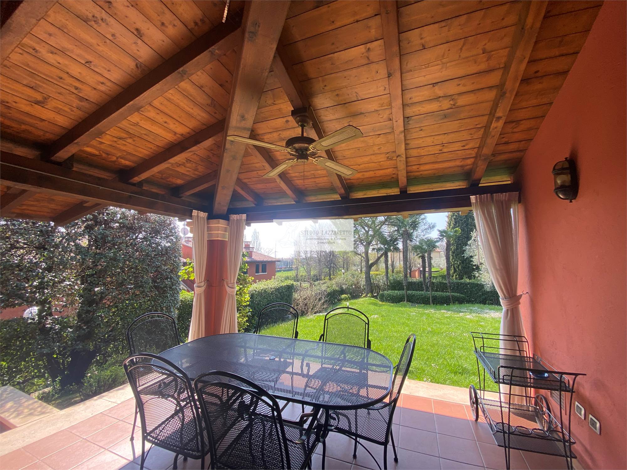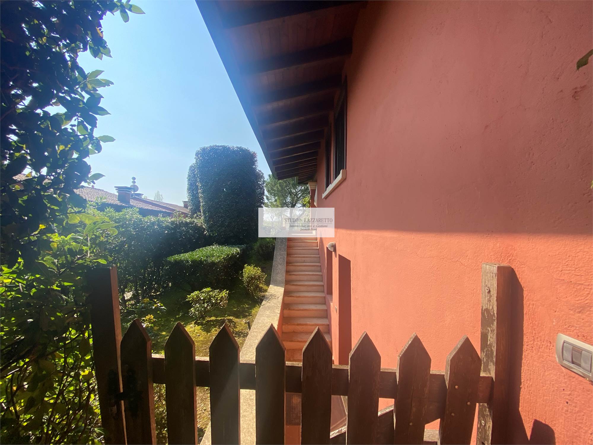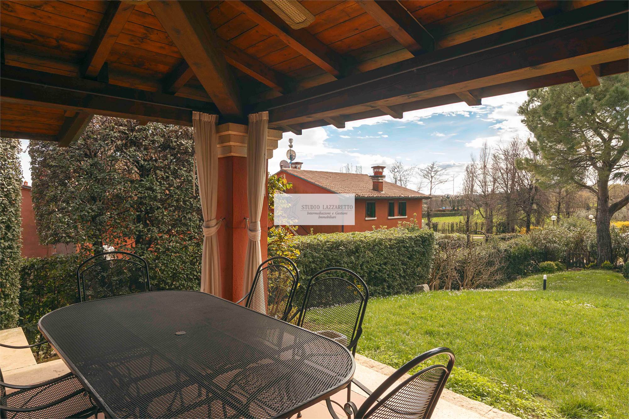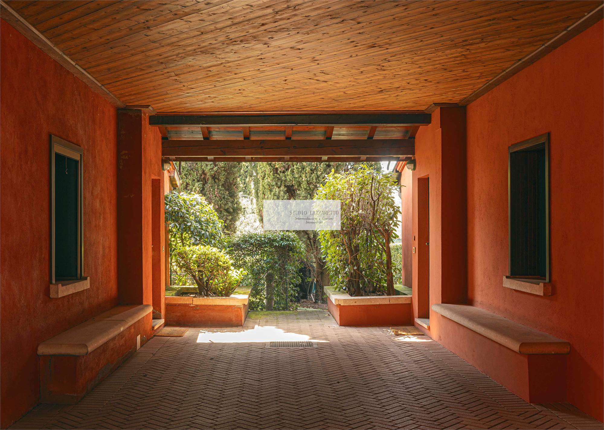 Esterni: ampio portico coperto attrezzato, giardino privato piantumato con impianto di illuminazione e irrigazione automatica,
