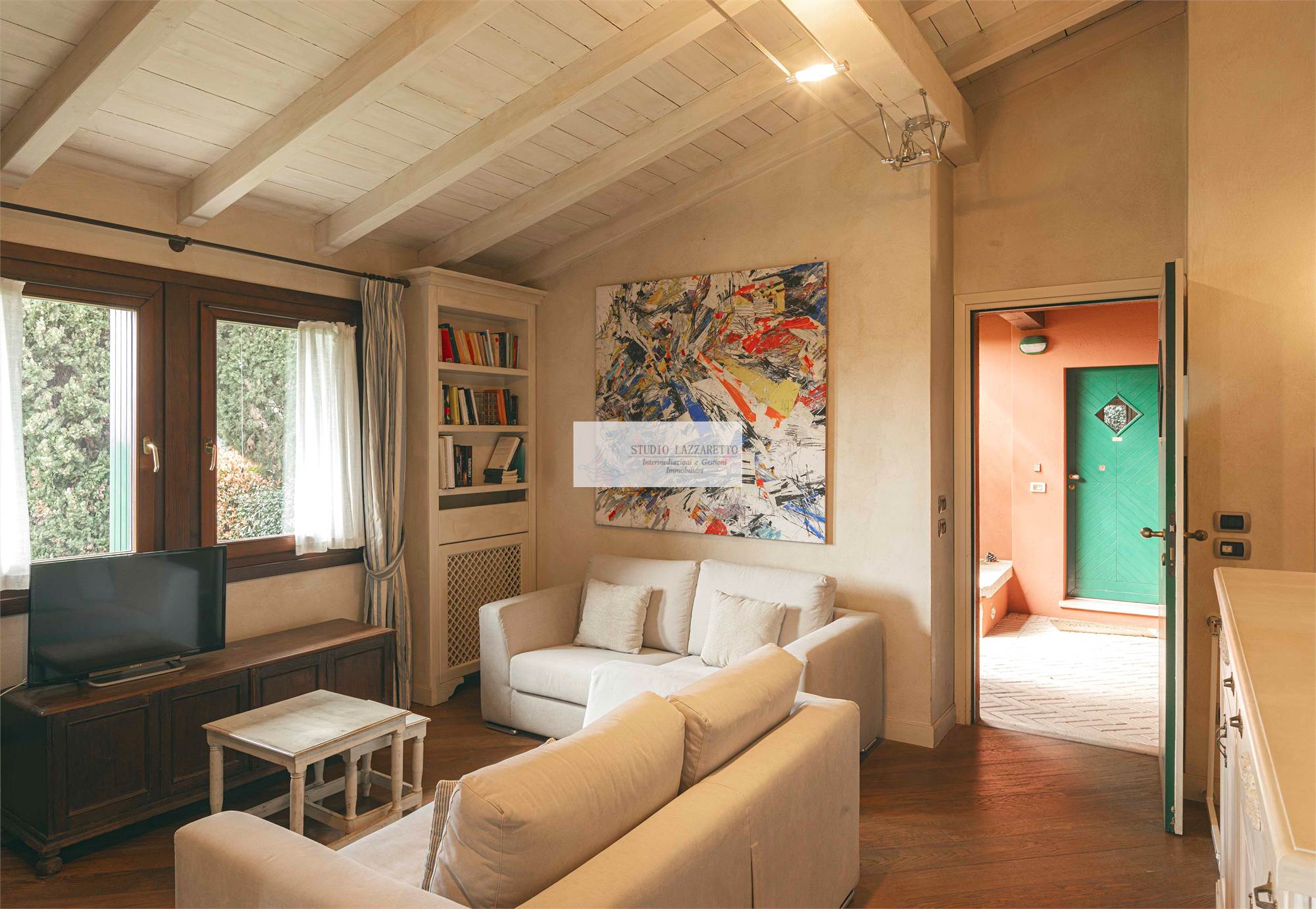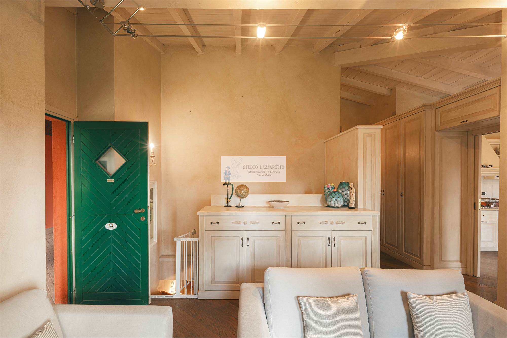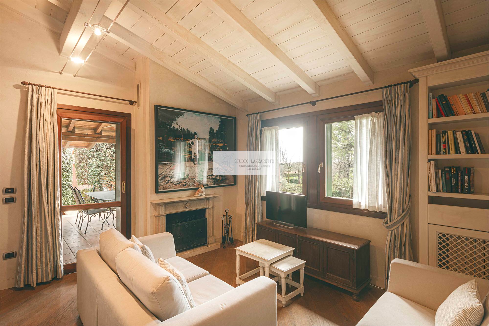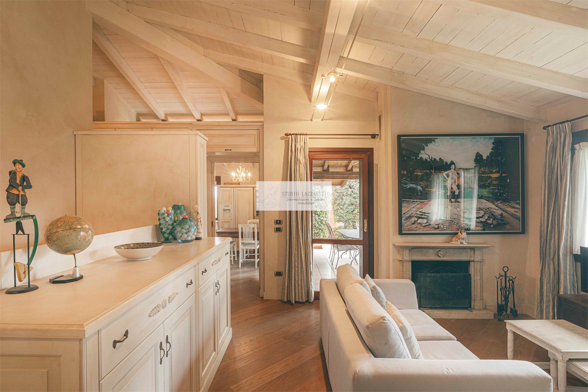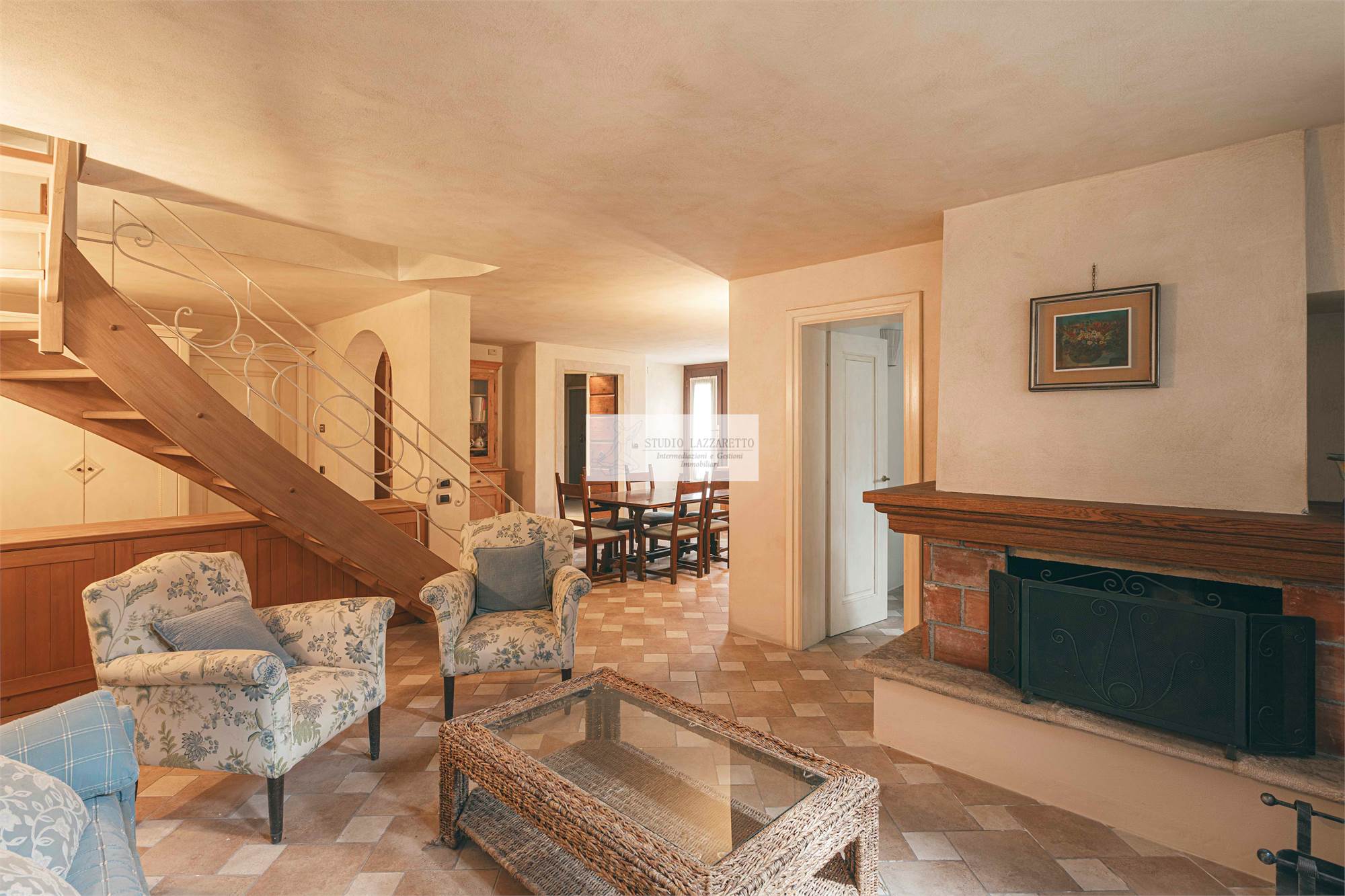 Ingresso su luminoso soggiorno con camino, ideale per momenti conviviali e di relax, con accesso diretto al portico al giardino e alla scala interna di collegamento con il piano seminterrato